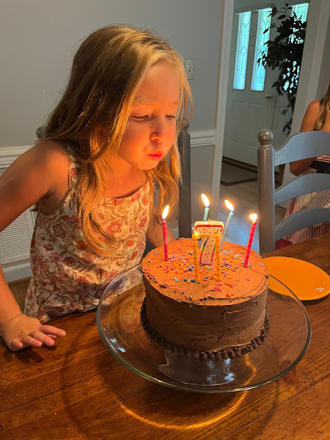 She headed off to school and then when she got home it was time for dinner (she picked mac and cheese) and cake! She wanted a strawberry cake with chocolate icing (but only a tiny bit of icing because she doesn't really like it).