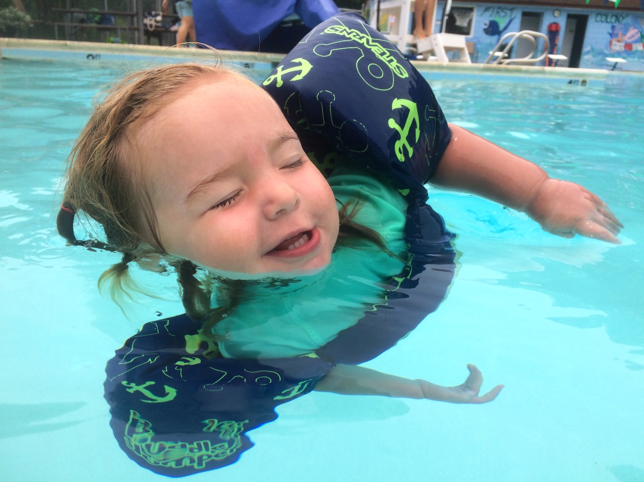 loved being in the water. Every time I get near her and try to grab her she sticks her little hand up and waves me away saying, "no, no, no!" She just loves her freedom floating on her tummy or sticking her toes up in front of her and floating on her back.